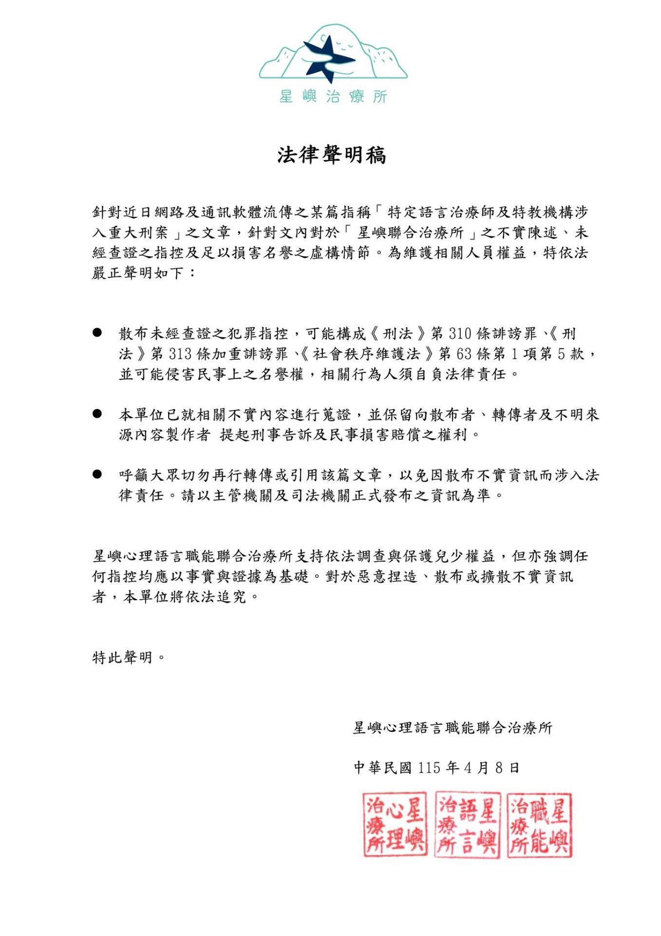 對於在網路上的不實發言,星嶼心理治療所、星嶼語言治療所、星嶼職能治療所發布聲明如下: